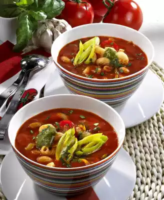 Puree canned tomatoes. Sweat onion cubes, garlic and herbs in oil. Add tomato paste and sweat it on. Add leek. After about 2 minutes, deglaze with stock and pureed tomatoes. Cook for 5 minutes. Season to taste with salt, pepper and sugar. Stir the noodles into the stew. Halve the cherry tomatoes and let them stand in the stew for 5 minutes. Chop parsley coarsely.