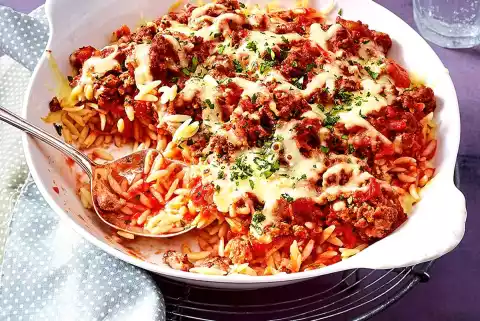 Peel and chop onion and garlic. Fry with minced meat in hot oil until crumbly. Add tomatoes and herbs, bring to the boil, simmer for about 5 minutes. Season with salt and pepper. Drain the pasta, put it with sauce in an ovenproof dish, sprinkle cheese over it.