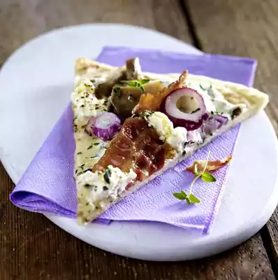 Spread on the bread. Cover with mushrooms and bacon. Spread cheese over it. Bake in the preheated oven (electric cooker: 225°C/circulating air: 200°C/gas: 4) for 7-10 minutes.