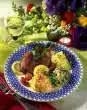 Remove the meat and put it aside. Sauté onion and garlic in hot frying fat. Add vegetables and 750 ml water, bring to the boil and stir in the stock. Let simmer for 5 minutes at low heat.