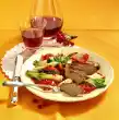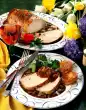 Peel and finely dice the onion and garlic. Wash the meat, dab dry. Cut into large pieces and season with salt and pepper. Heat oil in a large pan, fry meat on each side for 3-4 minutes until golden brown.