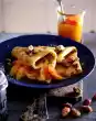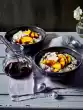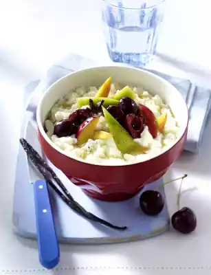 Pour rice pudding into a bowl. Mix the fruits with 1-2 tbsp. of the marinade. Pour marinated fruit over the rice pudding. Sprinkle with the rest of the marinade