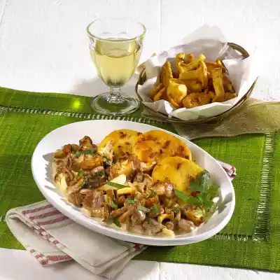 Season with salt and pepper. Pour vegetable stock and cream into the mushrooms and cook for about 5 minutes. Wash parsley, dab dry and cut into strips except for a little bit for garnishing. Lightly thicken mushroom sauce with sauce thickener.