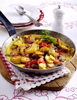 Remove the potatoes. Heat 1 tablespoon of oil in a frying pan. Brown the meat in it. Season with salt and pepper and take out. Sauté onion and diced ham in hot frying fat. Fry the potatoes briefly.
