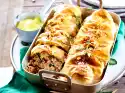 Peel and finely dice the onion and garlic. Heat 2 tablespoons of oil in a frying pan. Fry the minced meat in it until crumbly. Fry the onion and garlic briefly. Add tomatoes, bring to the boil and simmer for about 10 minutes. Season with 1⁄2 TL Baharat, salt and pepper.