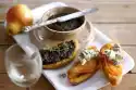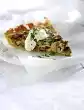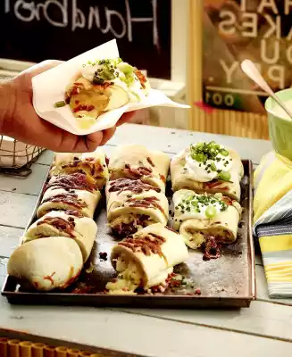 Clean spring onions. Wash together with chives, shake dry and cut into fine rolls. Remove bread strands from the oven and cut into 4 pieces. Smear hand breads with sour cream.