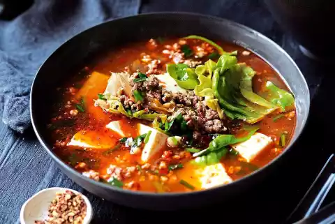 Peel and finely chop the ginger and garlic. Heat the oil in a wok or large pot. Fry the ginger and garlic in it while turning. Add Szechuan pepper and minced meat and fry for about 5 minutes, turning vigorously. Stir in chilli-bean sauce, add 1 l water and the rest of the rice wine and soy sauce mixture. Stir in stock, bring to the boil and simmer for about 5 minutes. Stir starch with 1-2 tbsp. cold water until smooth. Stir into the soup, bring to the boil and simmer for about 1 minute.