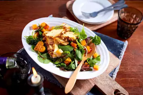 Sort the salad, wash and spin dry. Clean, wash and slice the persimmon. Cut out 1 heart from 1 slice, dice the rest. Peel and finely dice the shallot. Mix vinegar, salt and pepper. Fold in the oil. Cut cheese into slices. Mix salad with kaki cubes, shallot and vinaigrette and serve. Add the cheese and garnish with the kaki heart.
