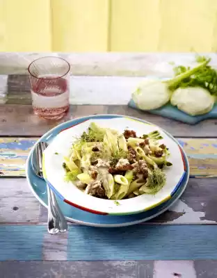 Cook the pasta in plenty of boiling salted water according to the instructions on the packet. Heat 2-3 tablespoons of oil in a large frying pan. Stew the fennel and onions for 5-6 minutes while turning. Season with salt and pepper and remove from the pan. Put 2 tablespoons of oil into the hot pan, fry the minced meat crumbs while turning. Season with salt and pepper, add fennel, deglaze with white wine and stock. Bring to the boil and simmer for about 2 minutes. Stir cream cheese into the sauce and melt in it