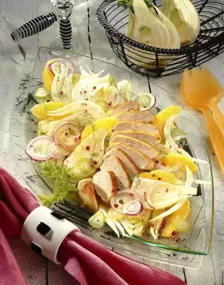 Peel the other one so that the white skin is completely removed. Cut the fillets out of the parting skins, collecting the juice. Peel the onion and cut into thin rings. Remove meat from the pan and cut into slices. Add orange juice to the frying fat and bring to the boil briefly. Add vinegar and remaining oil, season to taste with salt and pepper. Mix fennel and orange fillets. Put them on a plate. Arrange the chicken fillet slices on top and pour the orange sauce over them.