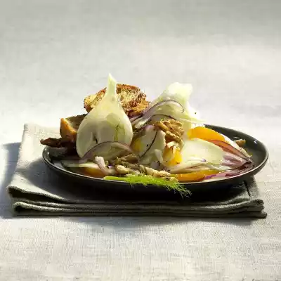 Whip orange juice, honey, vinegar and oil. Season with salt and pepper. Stir in the fennel greens. Mix salad ingredients and marinade. Cut rolls into very thin slices. Melt butter. Fry the slices of bread roll until golden brown and serve with the salad