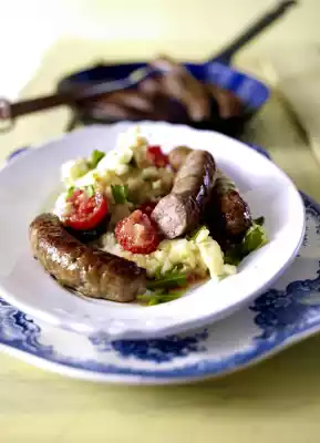 In the meantime, heat 2 tablespoons of oil in a second pan and fry the sausage in portions for about 6 minutes each. Arrange sausage and puree