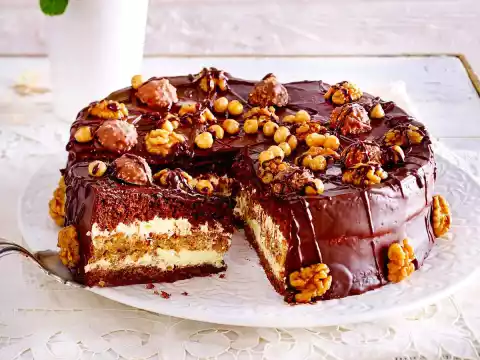 Cut the chocolates in half. Roast the hazelnuts and remaining walnuts briefly in a pan without fat, take them out and let them cool down. Heat cream and coconut oil. Chop the chocolate coating, add to the cream and remove from the heat. After approx. 5 minutes mix to a smooth glaze. Cover the cake with the icing, leaving 2 tablespoons of icing aside. Decorate the cake with pralines, hazelnuts and walnuts. Cover with the rest of the icing in strips. Chill for about 1 hour.