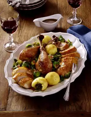 Also pour into the pot through a sieve. Degrease with a ladle. Bring the sauce to the boil, thicken with sauce thickener and season with salt and pepper. Cut the turkey into pieces. Arrange turkey pieces, dumpling stars and Brussels sprouts on a plate.
