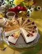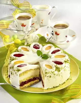 Stir in 100 ml advocaat. Squeeze the gelatine well and dissolve at lukewarm temperature. Remove 2-3 tablespoons of yoghurt mass and mix with the liquid gelatine. Stir the gelatine mixture into the remaining yoghurt mass. Whip 100 g cream until stiff. When the liqueur mass begins to gel (approx. 10 minutes), fold in the cream. Spread the cream on the 2nd base. Place the last base on top. Chill for about 4 hours. Whip 400 g cream and 2 packets of vanilla sugar until stiff. Fill a good 1/4 of the cream in a piping bag with a medium perforated spout and chill. Spread the remaining cream on the cake. Spray about 10 "Easter eggs" onto the surface of the cake. Stir cherry jelly until smooth. Fill Easter eggs alternately with 50 ml advocaat and cherry jelly. Chill the cake for at least 1 hour. Before serving, sprinkle with pistachios and serve decorated with lemon balm