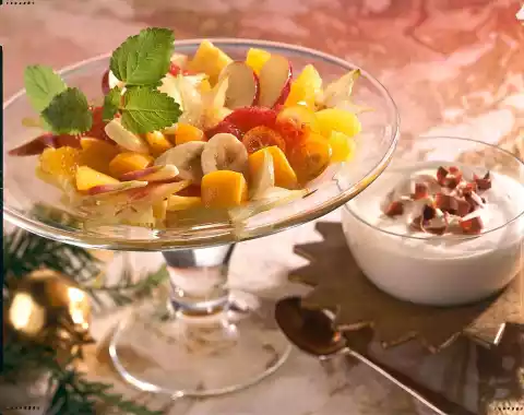 Whip cream, vanilla sugar and cinnamon until half stiff and sprinkle with chocolate slicer. Arrange the fruit salad in a bowl and serve decorated with lemon balm as desired. Serve with cinnamon cream.