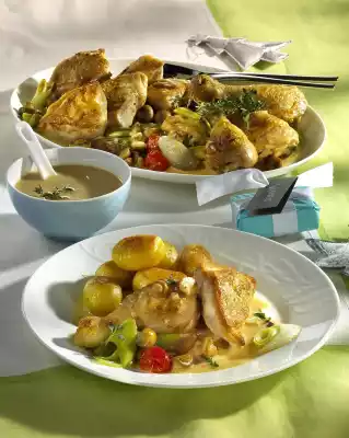 Take it out. Fry the shallots, garlic, 4 thyme stalks and leek in the frying fat for about 5 minutes. Deglaze with vermouth and boil down for about 3 minutes. Add chicken stock and cream and bring to the boil. Add chicken parts and stew covered for about 25 minutes.