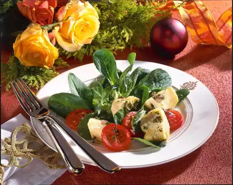 Clean, wash and drain the salad. Clean, wash and slice the tomatoes. Drain artichokes on a sieve and cut into quarters. Season vinegar with salt, pepper and sugar.