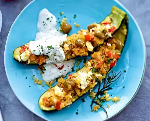 Fill with the bulgur mixture. Bring 500-750 ml water and stock to the boil. Pour on enough liquid broth that the zucchini are in liquid to approx. 2⁄3 Put 1 sprig of rosemary into the pan or fat pan.