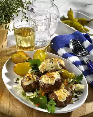 Season with salt and pepper. Cut feta cheese into fine slices, wash and chop thyme. Spread on the meatballs and put them on a baking tray. Bake briefly under the hot grill. Mix salad and remaining oil, season if necessary.