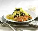 Roast the nuts in a pan without fat for about 4 minutes. For the vinaigrette, wash the lemon hot, grate dry, cut the peel thinly into strips with a pestle ripper, squeeze out the juice. Whisk 4 tablespoons lemon juice, salt, pepper and honey. Add 4 tablespoons of oil drop by drop. Stir lemon zest into the vinaigrette. Peel the shallots and cut into rings. Cut cheese into eighths and wrap each in 1/2 slice of bacon.