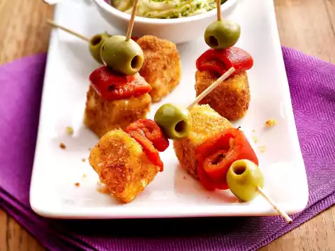 Drain the peppers and cut them into 12 strips. Put the olives, pepper strips and feta cubes on skewers. Arrange the aioli with the feta skewers and serve.