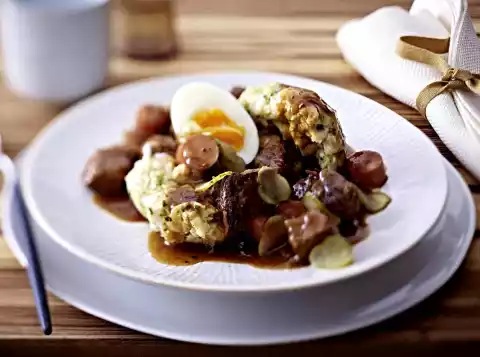 Season goulash with salt and pepper. Serve with egg halves and bread dumplings. Spread cucumber slices on top.