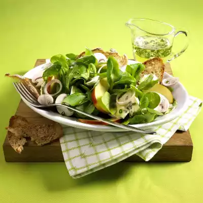 Clean lamb's lettuce, wash very thoroughly and drain. Cut bread into very thin slices and roast lightly in a toaster. Core the apple and cut into thin slices. Cut cheese into thin slices.