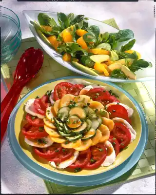 Clean, wash and pat dry the lamb's lettuce. Peel oranges so that the white skin is completely removed. Cut the fruit fillets out of the parting skins. Collect the juice. Cut avocados in half, remove the stone, remove the flesh from the skin and cut into slices.