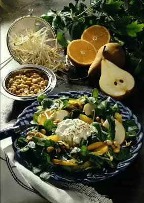 Wash the pears, quarter them, cut out the core. Cut pear quarters into thin slices. For the dressing, whip cream until stiff. Season with salt, pepper and horseradish. Arrange corn salad, sprouts, oranges, pears and peanuts on plates, pour orange juice over them.