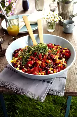 For the salad, drain beans, rinse with cold water and drain. Drain the corn and let it drain. Peel and finely chop the onion. Clean, wash and cut the bell peppers into pieces. Wash tomatoes and cut into large pieces.