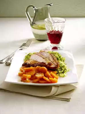 Heat the fat in a saucepan. Sauté diced onions for about 4 minutes until translucent. Add carrots. Deglaze with apple juice and season with salt and coriander. Steam in a closed pot for about 10 minutes. Cook Bulgur in boiling salted water for about 10 minutes until al dente
