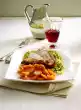 Wash the meat, dab dry. Mix Harissa and 1 tablespoon of oil. Spread the meat evenly with the paste. Wash parsley, shake dry, pluck leaves from the stalks and chop finely. Peel, wash and slice the carrots. Peel and finely chop the onion