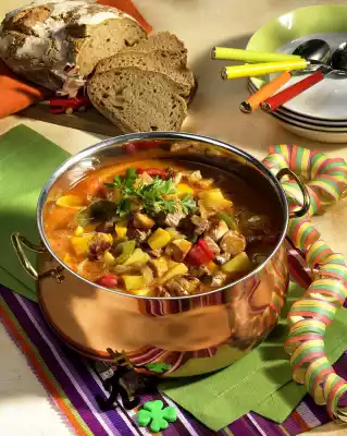If necessary, cut meat cubes a little smaller. Heat the oil in a large pot, fry the meat vigorously in portions, season with salt and pepper and remove. Add onion, mushrooms, bay leaf, dried parsley and paprika and fry for about 10 minutes, turning. Add meat and tomato paste and mix. Dust with flour and sauté for about 2 minutes. Season with some salt, pepper and Tabasco. Deglaze with broth and bring to the boil. Stir in the potatoes and let them braise at low to medium heat covered for about 2 hours. Season soup again with salt, pepper, Tabasco and sugar.