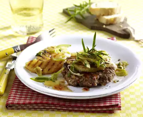 Wash the rosemary and shake dry. Heat 1 teaspoon of oil in a grill pan. Fry the minced steaks on both sides for 2-3 minutes. Add pineapple to the pan and fry briefly. Heat 1 teaspoon of oil in a second pan.