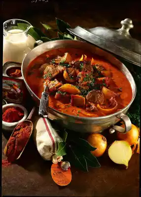 Onions peel and cut into slices. Heat the oil in a large pan and fry the meat in portions and remove. Sauté the onions in the frying fat. Add meat again and season with salt, pepper and paprika. Add tomato paste, tomatoes with liquid and bay leaf.