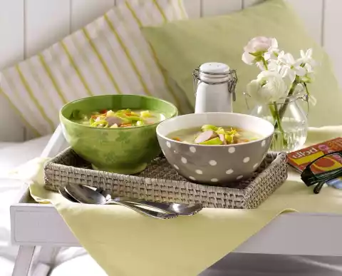 Add stock and chilli, bring to the boil and simmer for 10 minutes. Cut the sausages into slices. Add sausages and leek and cook for the last 4-5 minutes. Stir in the mashed potatoes and let it swell for 1 minute. Stir again, season to taste with salt and pepper.