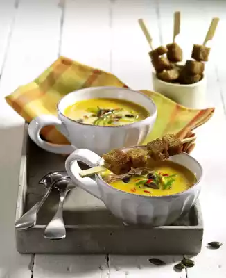 Fold in the leek. Arrange in cups, sprinkle with pumpkin seeds and the remaining chilli. Add the crouton skewers.