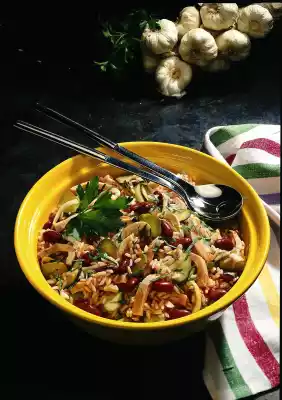 Season to taste with 2-3 tablespoons of cucumber water and chilli powder. Rinse rice briefly with cold water and drain. Mix with the prepared ingredients and let it stand for a short time. Season again.