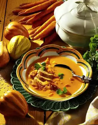 Clean, wash and cut the carrots into small cubes. Peel and dice the onion. Crush the coriander in a mortar. Heat 10 grams of fat in a pot, fry the onions until translucent, sprinkle with coriander. Add carrots and stock and bring to the boil. Simmer covered for 10 to 15 minutes. Meanwhile, wash the meat and pat dry. Heat the oil in a pan and fry the chicken fillets for ten to twelve minutes, turning them over. Drain the pumpkin on a sieve. Finely dice some pumpkin pieces and set aside. Peel the garlic and press it through a garlic press. Cut toast into rhombs. Remove two to three tablespoons of carrot cubes from the stock with a skimmer and add to the finely diced pumpkin. Add the remaining pumpkin to the soup and puree everything finely. Cut the chicken filet into thin slices. Add meat and vegetable cubes to the soup, bring to the boil again briefly and season with salt and cayenne pepper. Heat the remaining fat in a pan and roast the toast in it until golden brown. Finally add sesame and garlic. Arrange the soup in deep plates and serve sprinkled with fresh coriander green and croutons