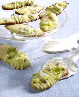 cut off. Decorate the cookies with chocolate strips, sprinkle with decorating sugar and lime zests and let them dry.