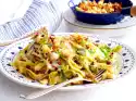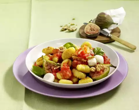 Prepare the pasta in boiling salted water according to the instructions on the packet. In the meantime drain the mozzarella. Wash and halve figs, chop nuts. Wash, clean, quarter and seed the tomatoes. Cut the flesh into small cubes. Crisp up the ham in a pan and dust with flour. Add figs, fry for 2 minutes.