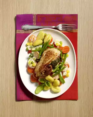 Wash the fillets, dab dry, cut a deep pocket in each. Fill with figs and basil leaves, pin up. Heat oil. Fry the fillets in it over medium heat for 12 to 15 minutes, turning them over. Season with salt and pepper. In the meantime, place the vegetables in 200 millilitres of boiling water without defrosting them.