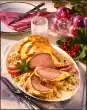 Mix icing sugar and 2-3 tablespoons of hot water. Spread half of the gingerbread still warm. Decorate with half almonds, cherries and pistachios