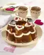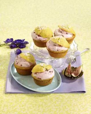Bake the muffins in a preheated oven (electric range: 175 °C/ convection oven: 150 °C/ gas: stage 2) for 25-35 minutes. Remove the muffins from the oven, let them cool down for about 5 minutes, then turn out of the tins onto a cake rack and let them cool down. Whip the cream until stiff and allow vanilla sugar to trickle in. Stir in fig puree, grenadine and the remaining fig cubes. Cut a small lid off the muffins. Spread the fig cream on the muffins with a tablespoon. Put the lid on top and decorate with crumbled meringue