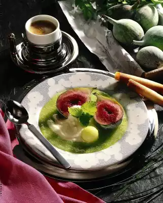 Divide into 4 small plates. Wash the figs, dab dry and cut in half. Place on the sauce pan. Whip cream and sugar until semi-stiff, stir in lemon juice and zest. Spread lemon cream over the figs and serve decorated with lemon balm and melon ball.