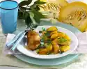 Halve the melon (use one half for other purposes) and remove the seeds with a spoon. Cut out 4 balls with a ball cutter. Remove the rest of the pulp, place in a bowl, add brandy and puree.