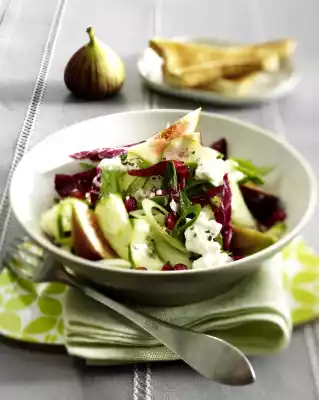 Mix cucumbers, radicchio, spring onions and figs. Mix in dressing just before serving. Crumble the feta and spread on top.