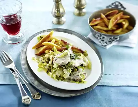 Meanwhile melt butter in a large pan. Fry the potato noodles until golden brown. Season to taste with salt. Arrange filder cabbage and potato noodles