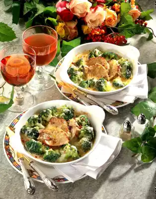 Cut the fillets open and put them into small ovenproof dishes with broccoli. Pour sauce over them and sprinkle the rest of the cheese over them. Gratinate in a hot oven (electric cooker: 225 °C/ circulating air: 200 °C / gas: level 4) for approx. 5 minutes. Serve with croquettes